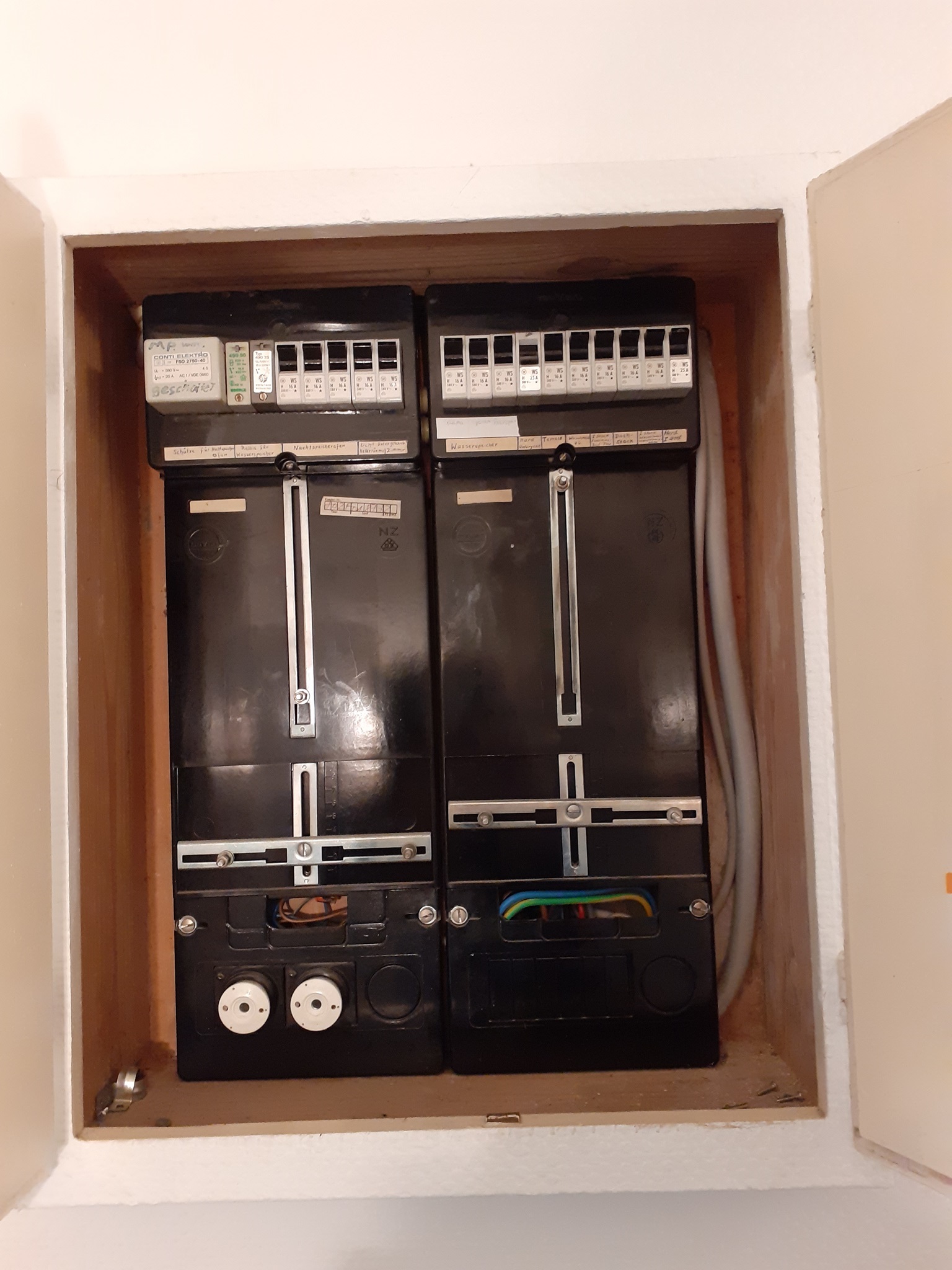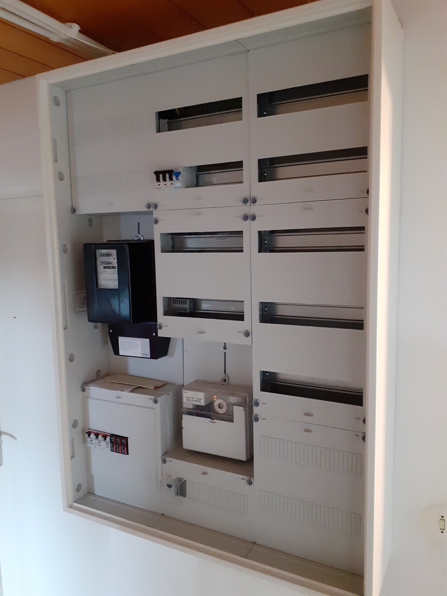 Die Herausforderung bestand darin, dass die gesamte Elektrik bereits älteren Baujahrs ist und es daher notwendig war den alten Zählerschrank durch einen neuen zu ersetzen. Im Haus werden auch Nachtspeicheröfen betrieben und so fiel der nötige Zählerschrank etwas größer aus (wegen notwendigem Zählerfeld für das TSG (Tarifschaltgerät).